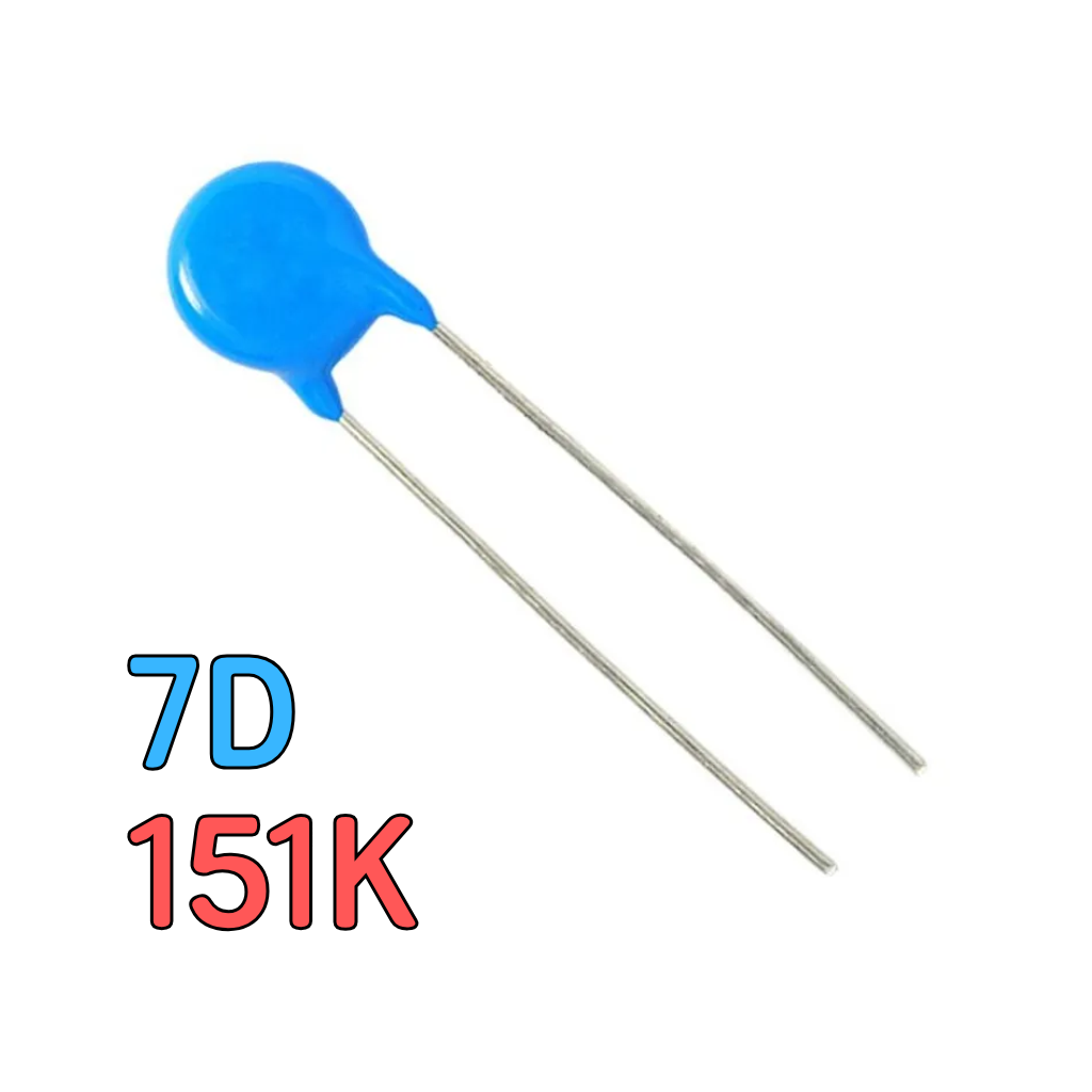 ZOV 07D151K — дисковый оксидно-цинковый варистор серии 7D номинальным напряжением 150 В.